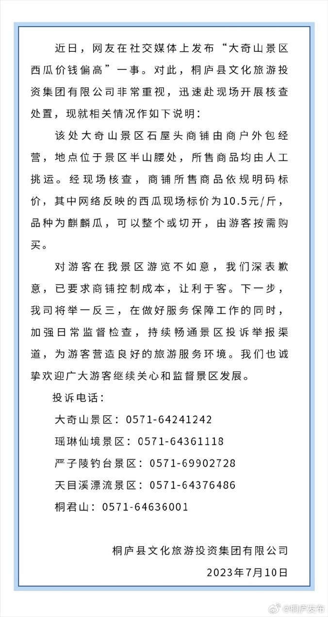 ·一游客反映大奇山景區(qū)一個西瓜賣200多元。10日,桐廬文旅集團(tuán)致歉稱,商品均由人工挑運(yùn),對游客在景區(qū)游覽不如意深表歉意,已要求商鋪控制成本,讓利于客。
