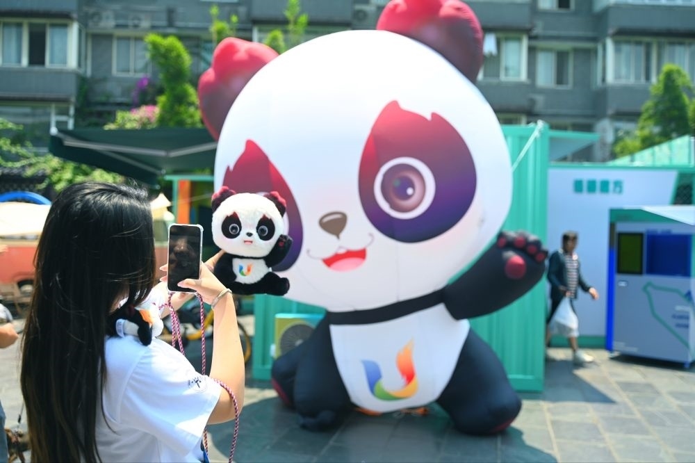 市民拿著大運(yùn)會吉祥物“蓉寶”合影。成都大運(yùn)會執(zhí)委會供圖
