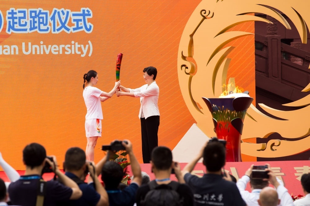 7月2日,第一棒火炬手吳敏霞(左)接過點燃的火炬。當(dāng)日,成都第31屆世界大學(xué)生夏季運(yùn)動會火炬?zhèn)鬟f成都站起跑儀式在四川大學(xué)校園內(nèi)舉行。新華社發(fā)(曹鵬攝)