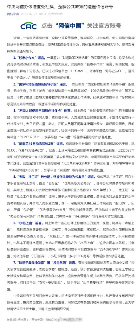 ·中央網(wǎng)信辦查處杜撰歪解公共政策造謠傳謠賬號,通報(bào)典型案例,共處置違法違規(guī)賬號373個(gè)。
