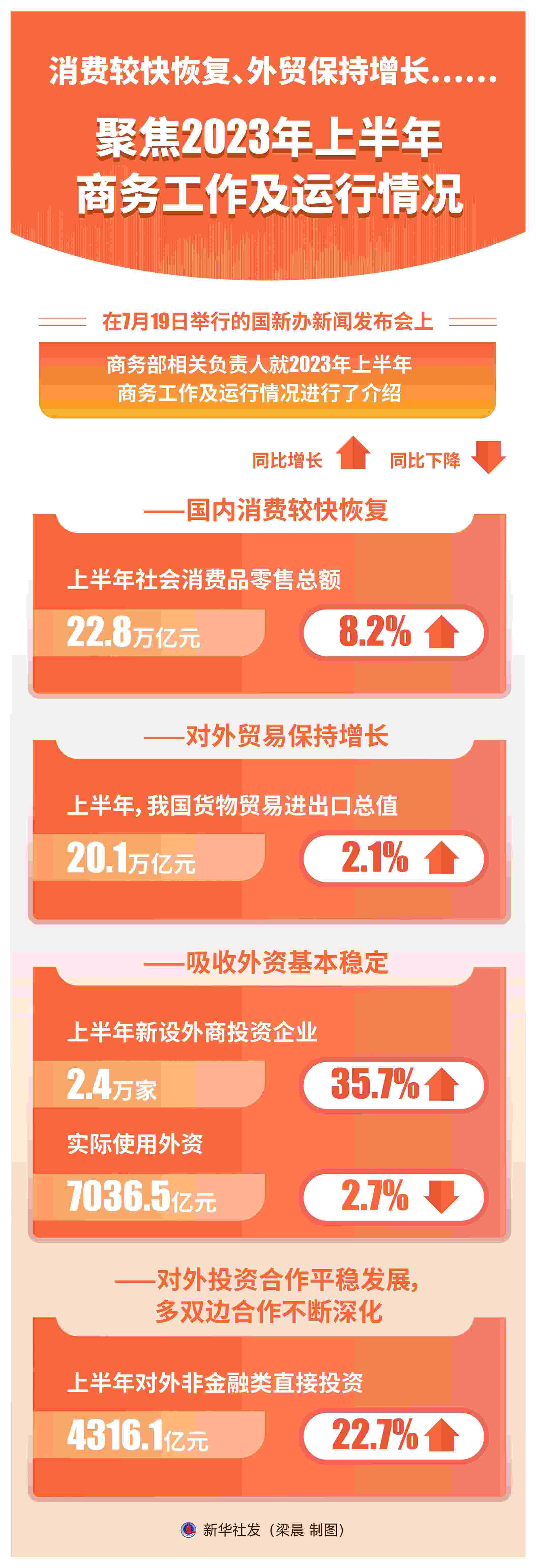 新華社北京7月19日電 題:消費(fèi)較快恢復(fù)、外貿(mào)保持增長(zhǎng)……聚焦2023年上半年商務(wù)工作及運(yùn)行情況