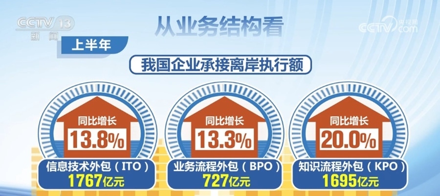 數據顯示,2023年上半年,我國企業(yè)承接服務外包合同額10917億元人民幣,執(zhí)行額7400億元,同比分別增長10.6%和14.7%。從業(yè)務結構看,上半年,我國企業(yè)承接離岸信息技術外包(ITO)、業(yè)務流程外包(BPO)和知識流程外包(KPO)執(zhí)行額分別為1767億元、727億元和1695億元,同比分別增長13.8%、13.3%和20.0%。其中,信息技術解決方案服務、管理咨詢服務、互聯網營銷推廣服務等離岸服務外包業(yè)務增速較快。