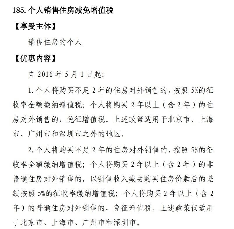 對于個人銷售住房減免增值稅的條件也未調整。即個人將購買不足2年的住房對外銷售的,按照5%的征收率全額繳納增值稅;個人將購買2年以上(含2年)的住房對外銷售的,免征增值稅。對于一線城市而言,個人將購買2年以上(含2年)的非普通住房對外銷售的,以銷售收入減去購買住房價款后的差額按照5%的征收率繳納增值稅。