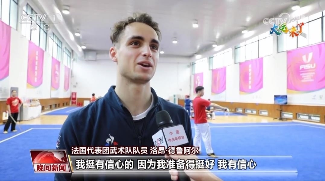 法國(guó)代表團(tuán)武術(shù)隊(duì)隊(duì)員 洛昂·德魯阿爾:我要比賽的項(xiàng)目是長(zhǎng)拳和棍術(shù)。我每天都會(huì)訓(xùn)練,一天一般訓(xùn)練兩次。我挺有信心的,因?yàn)槲覝?zhǔn)備得挺好,我有信心。?