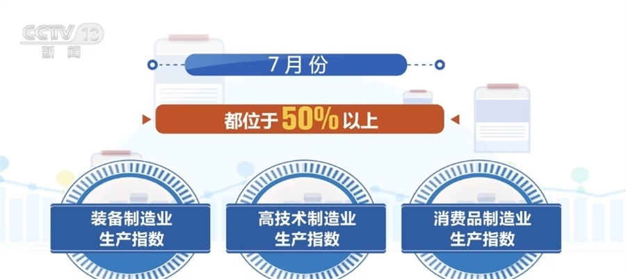 ?????? 國(guó)家統(tǒng)計(jì)局服務(wù)業(yè)調(diào)查中心二級(jí)巡視員 史朝暉:從具體的行業(yè)表現(xiàn)情況來(lái)看,7月份的石油煤炭加工、化學(xué)纖維及橡膠塑料制品,還有專用設(shè)備,鐵路、船舶、航空航天設(shè)備以及計(jì)算機(jī)通信電子設(shè)備,這些行業(yè)的生產(chǎn)指數(shù)和新訂單指數(shù)都是高于臨界點(diǎn)的,表明這些行業(yè)的產(chǎn)需兩端同步擴(kuò)張。