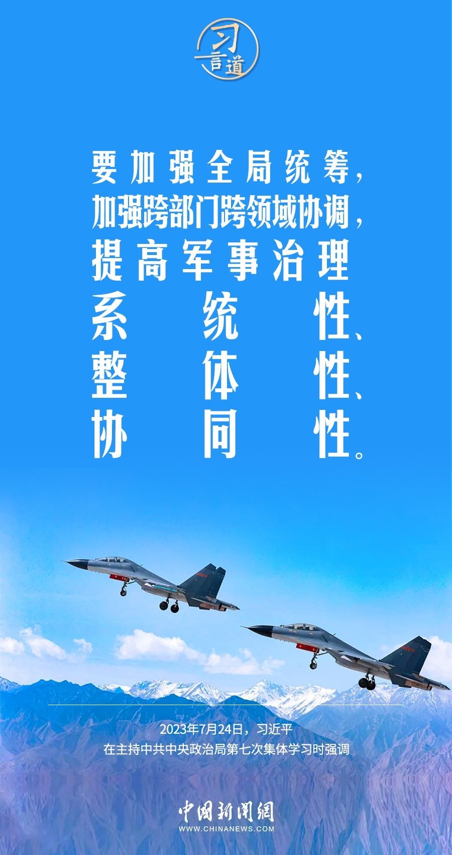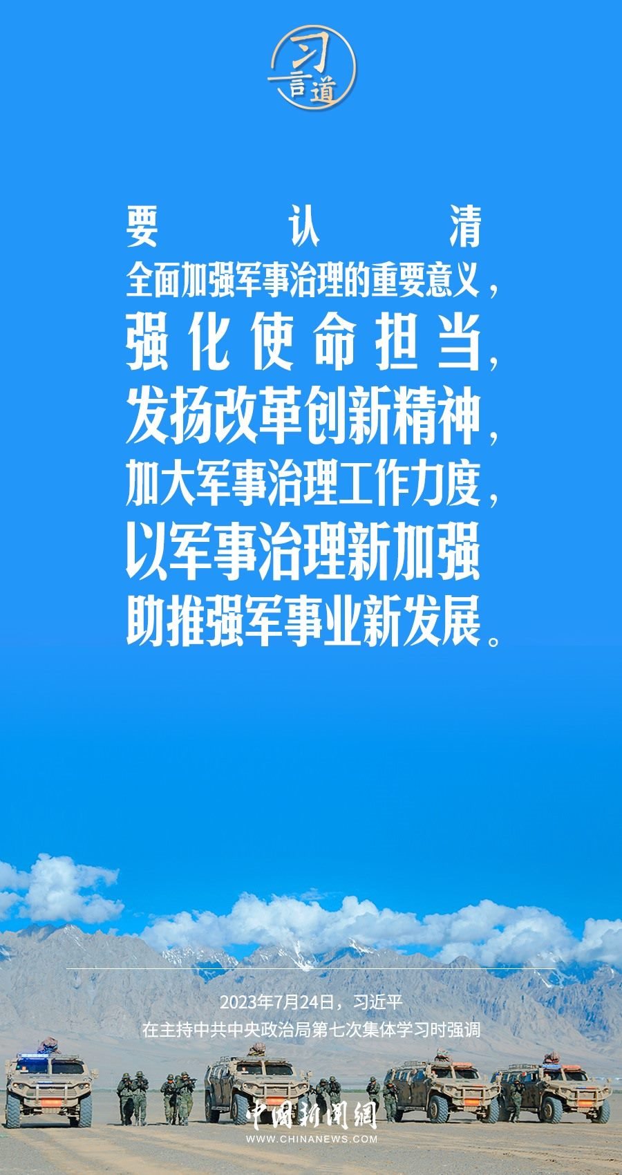 八一建軍節(jié)來(lái)臨之際,中共中央政治局7月24日下午就全面加強(qiáng)軍事治理進(jìn)行第七次集體學(xué)習(xí)。中共中央總書記習(xí)近平主持學(xué)習(xí),他強(qiáng)調(diào)——