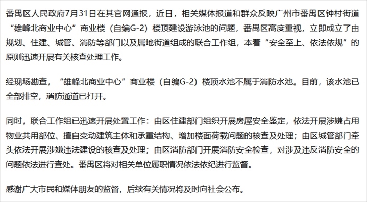 ·廣州番禺通報“樓頂建豪華泳池”:開展涉嫌違法建設(shè)核查。