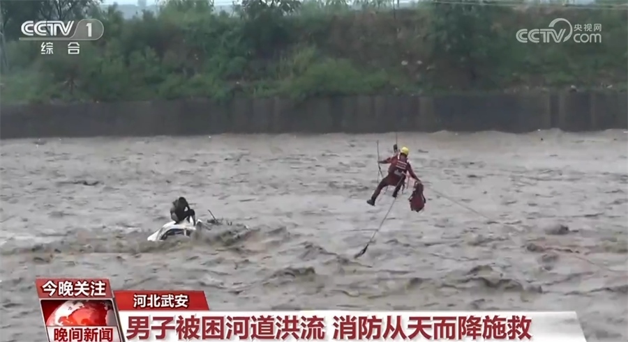 7月30日下午,河北武安一男子駕車(chē)涉水過(guò)橋時(shí),被湍急的洪水沖入洺河河道近百米,救援人員接警后立即趕往現(xiàn)場(chǎng)。從現(xiàn)場(chǎng)情況看,因水流過(guò)于湍急,被困車(chē)輛隨急流翻滾,洪流一度沒(méi)過(guò)車(chē)頂?,F(xiàn)場(chǎng)指揮員隨即協(xié)調(diào)起吊車(chē)等工程車(chē)輛協(xié)助進(jìn)行救援,最終經(jīng)過(guò)1小時(shí)20分的驚險(xiǎn)救援,被困男子成功獲救。