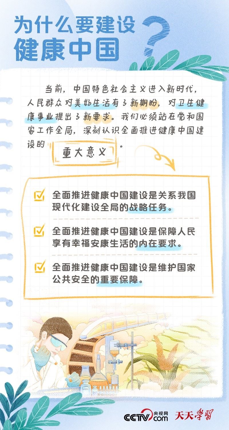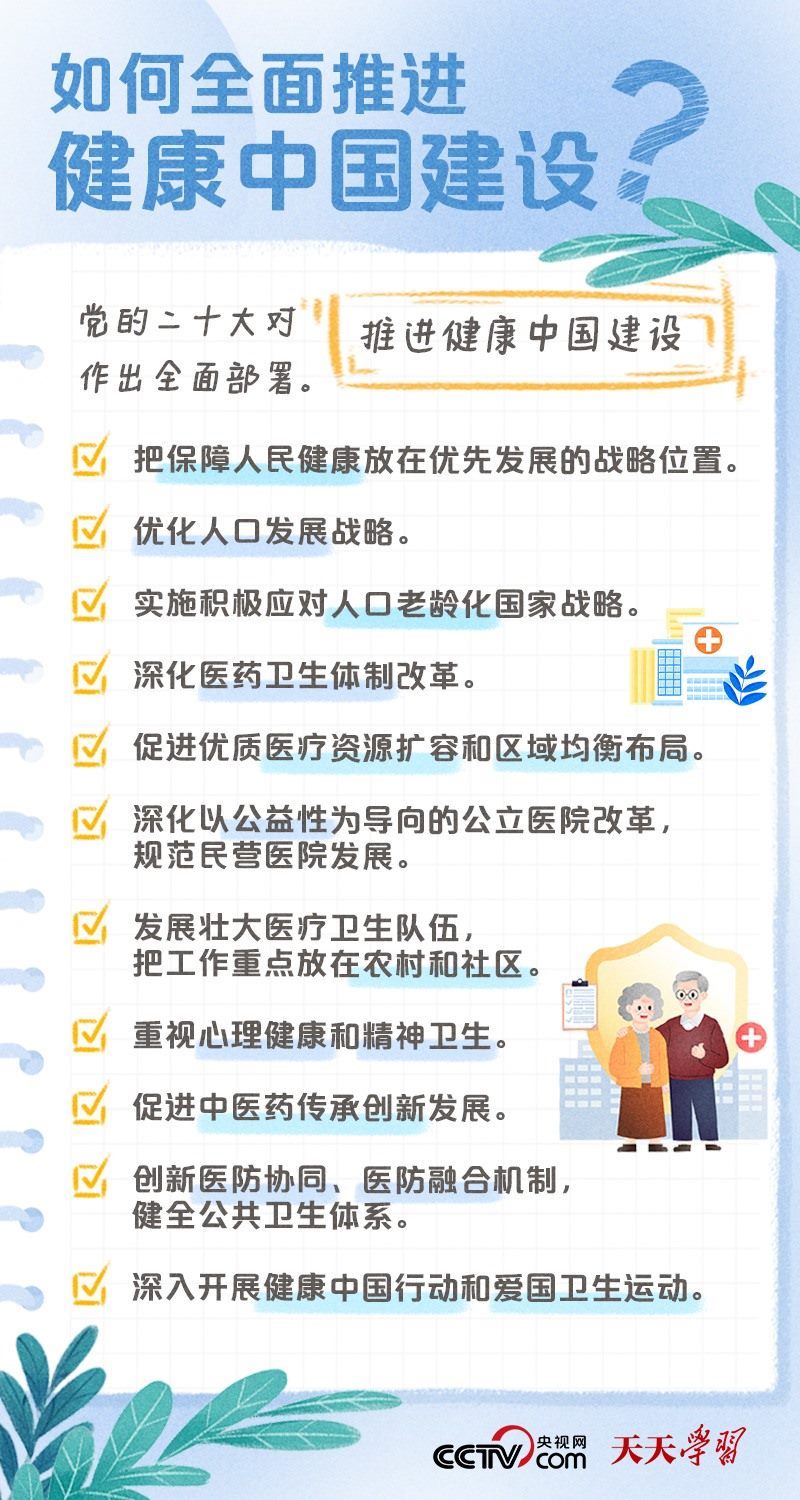 黨的二十大報告將“建成健康中國”作為到2035年我國發(fā)展的總體目標(biāo)之一,并指出,人民健康是民族昌盛和國家強盛的重要標(biāo)志,把保障人民健康放在優(yōu)先發(fā)展的戰(zhàn)略位置,完善人民健康促進政策。什么是健康中國?如何全面推進健康中國建設(shè)?央視網(wǎng)《天天學(xué)習(xí)·學(xué)習(xí)筆記》特梳理相關(guān)內(nèi)容,為您解讀總書記治國理政關(guān)鍵詞——健康中國。