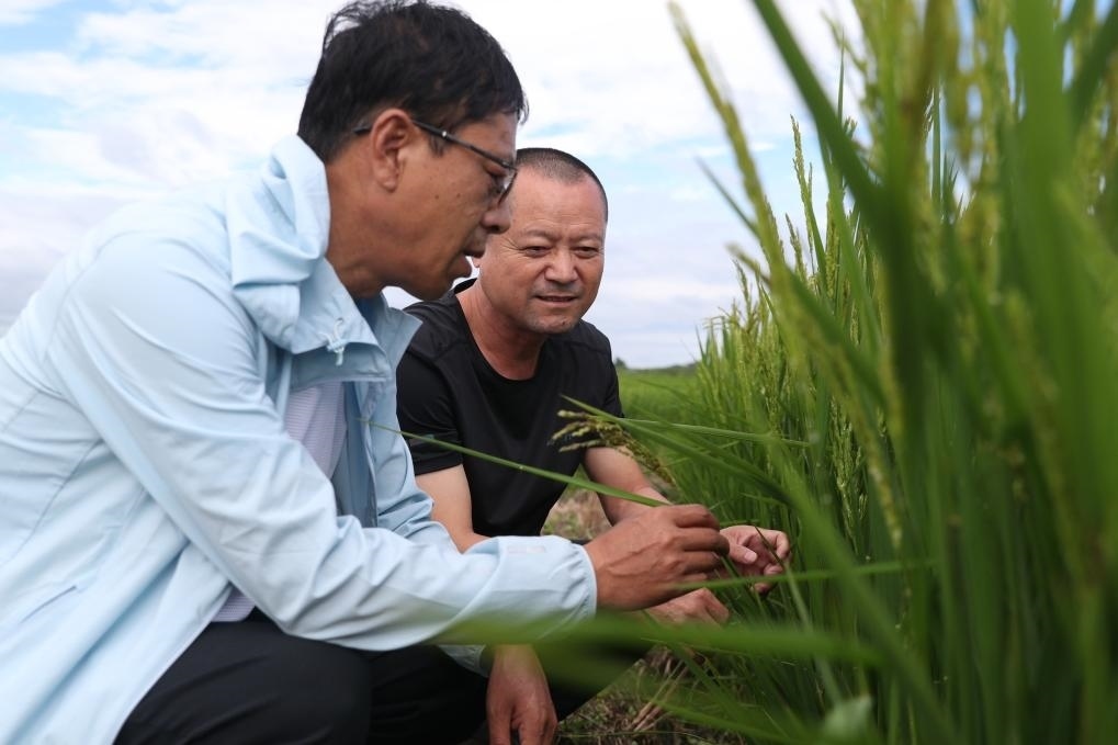 8月11日,黑龍江省尚志市農業(yè)技術推廣中心的工作人員在當地一處被洪水浸泡過的水稻田里查看水稻情況。新華社記者張濤 攝