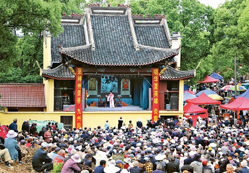 為豐富群眾文化生活,江蘇省南京市高淳區(qū)椏溪街道藍(lán)溪村專門邀請杭州青年越劇團(tuán)來村里演出,讓村民在家門口享受文化大餐。圖為2023年5月7日,藍(lán)溪村大山戲樓上,演員正在表演越劇《紅樓夢》。 人民圖片 高曉平/攝
