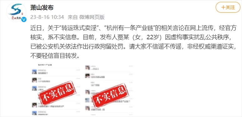 ·杭州蕭山辟謠“轉(zhuǎn)運(yùn)珠式賣(mài)淫”:發(fā)布人已被行政拘留。