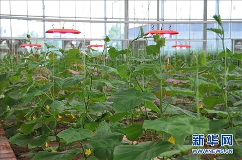 烏蘭察布冷涼蔬菜院士工作站試驗基地溫室內,利用植物生長燈模擬日光,增強光合作用,提高產(chǎn)品質量。新華網(wǎng) 周遠鋼 資料圖