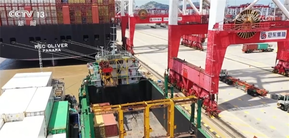在洋山港三期冠東碼頭,兩艘大型遠洋集裝箱船中間的這艘小船是來自江蘇太倉港的快航班輪,它剛剛完成200多個集裝箱裝卸。通過水路完成“水水中轉”,將這些集裝箱裝上遠洋貨輪出口海外,無需轉關申報或倉儲停留,實現(xiàn)了聯(lián)動接卸。
