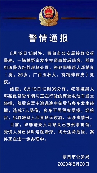 ·云南警方通報“26歲男子駕越野車連撞多車”:致7人受傷,犯罪嫌疑人有精神病史,已被刑拘。