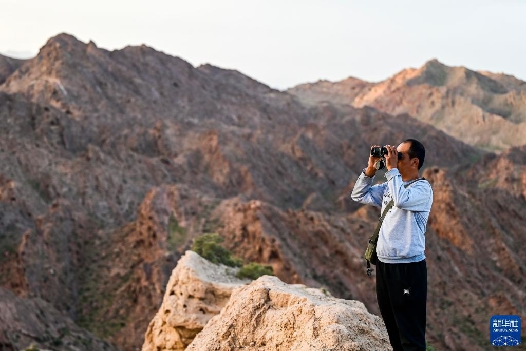 8月20日,董海寧利用望遠(yuǎn)鏡觀察遠(yuǎn)處長城情況。新華社記者 連振 攝