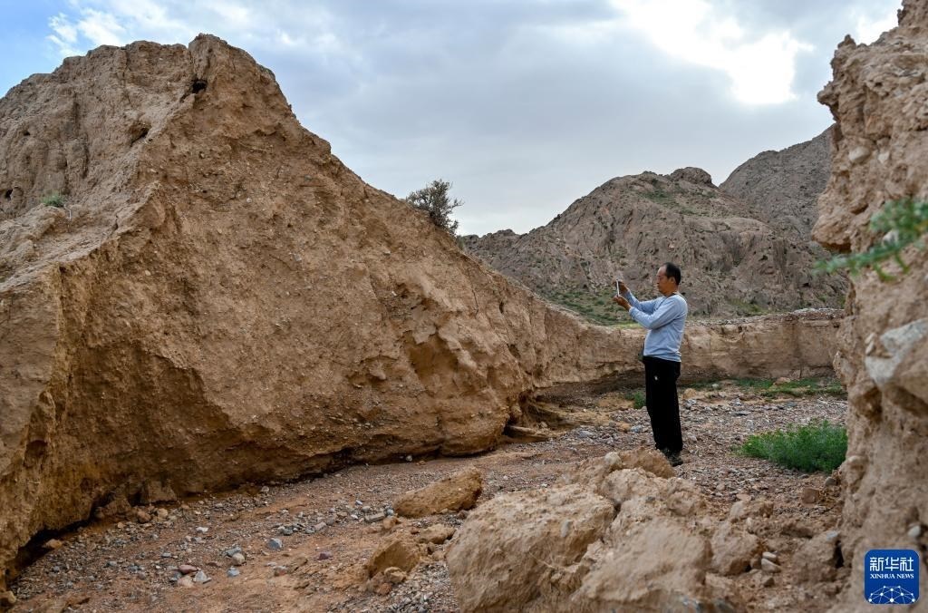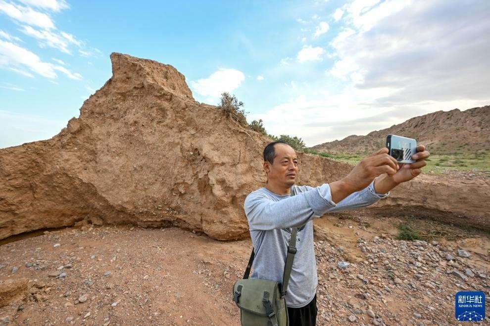 8月20日,董海寧巡查賀蘭山沿線的明長城永寧段時(shí)用手機(jī)拍照記錄。新華社記者 連振 攝