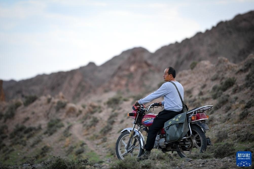 8月20日,董海寧騎摩托車巡查賀蘭山沿線的明長城永寧段。新華社記者 馮開華 攝