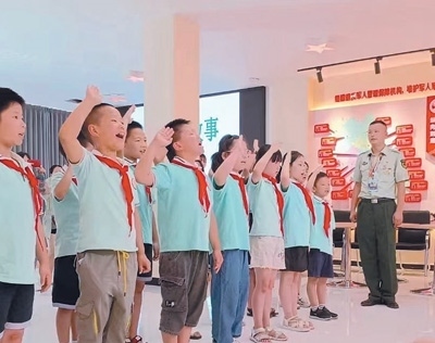 四川鹽亭縣文同小學(xué)學(xué)生在縣退役軍人之家活動中心學(xué)習(xí)英模事跡,獻唱少先隊隊歌。李 勤攝(人民視覺)