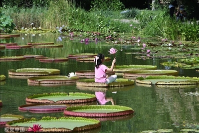 北京,國家植物園南園,公園舉辦王蓮承載小孩的活動。