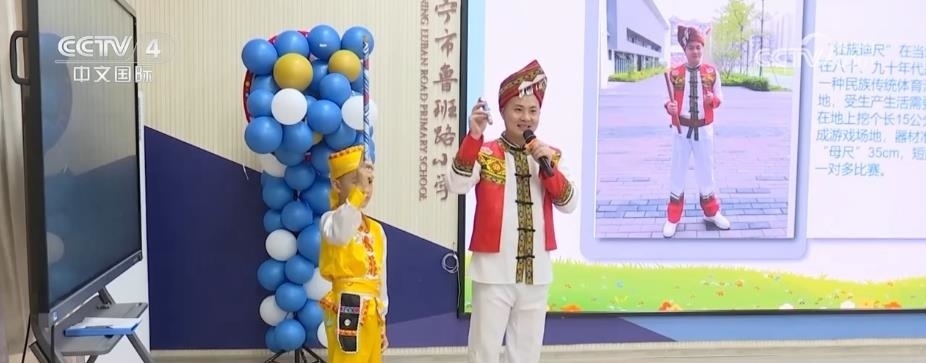 在南寧市魯班路小學(xué),同學(xué)們領(lǐng)略了獨(dú)具壯族特色的體育活動(dòng)《迪尺小課堂》。同學(xué)們還在開學(xué)典禮上身穿自己設(shè)計(jì)制作的扎染服飾,手拿親手制作的紅陶、皮影等非遺作品,表演了一場(chǎng)非遺秀。