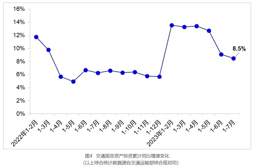 7月,完成交通固定資產(chǎn)投資3486億元,同比增長(zhǎng)5.3%。其中,完成公路投資2548億元,同比增長(zhǎng)3.9%;完成水運(yùn)投資168億元,同比增長(zhǎng)20.8%。