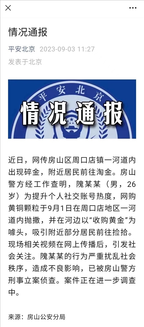 ·北京警方通報(bào)房山一河道出現(xiàn)碎金疑似物:實(shí)為一男子網(wǎng)購(gòu)黃銅顆粒拋撒。