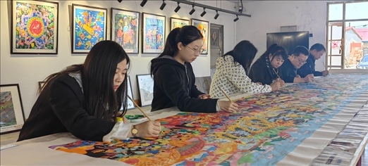 吉林省梨樹(shù)縣民間藝術(shù)家正在創(chuàng)作《關(guān)東七彩農(nóng)民畫(huà)、心系亞運(yùn)向未來(lái)》農(nóng)民畫(huà)。受訪者供圖