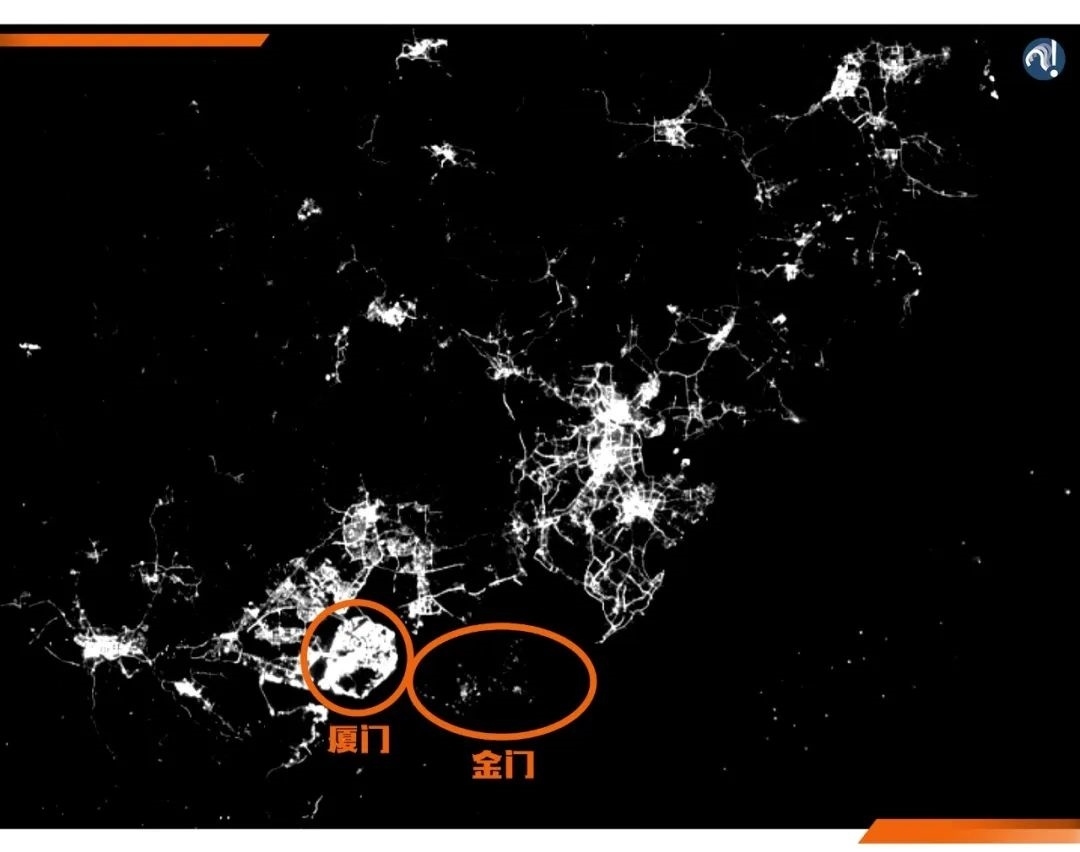 這是福建周邊的夜光遙感地圖??梢钥吹剑驮趶B門(mén)被點(diǎn)亮的時(shí)候,金門(mén)卻是一片漆黑。與此同時(shí),金門(mén)的發(fā)展也有個(gè)特點(diǎn),那就是靠近大陸的地方更亮。