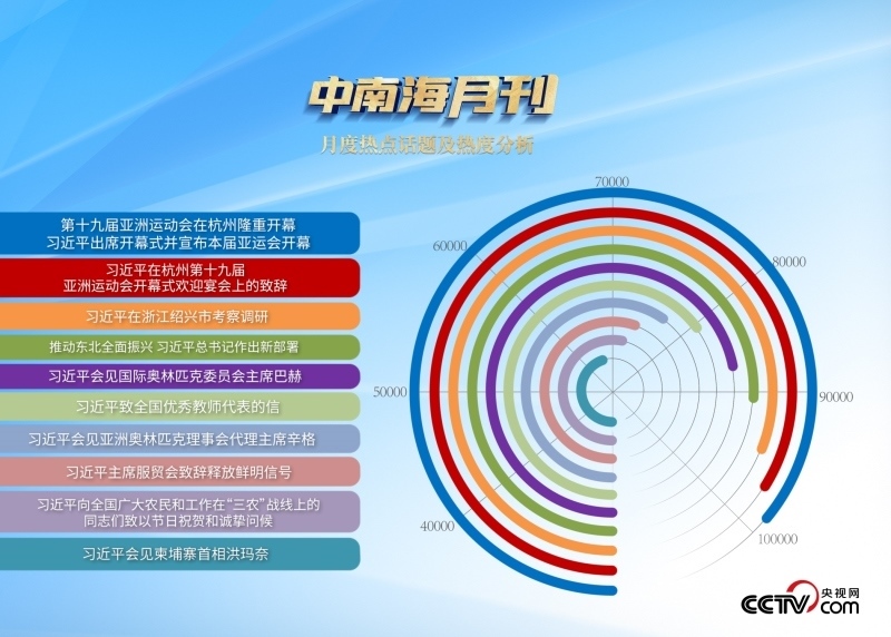 9月23日,在寓意豐收和團圓的秋分時節(jié),亞運之光映照神州大地,亞運之火點燃國人激情,綻放出健康中國的生動場景。中國以真摯的熱情歡迎亞洲體育健兒和國際貴賓,定格下四海賓朋如約而至的“杭州時刻”。央視網“智聞”系統(tǒng)提取分析的9月全網時政新聞熱點中,習近平主席在杭州亞運會期間的外交活動備受輿論關注。