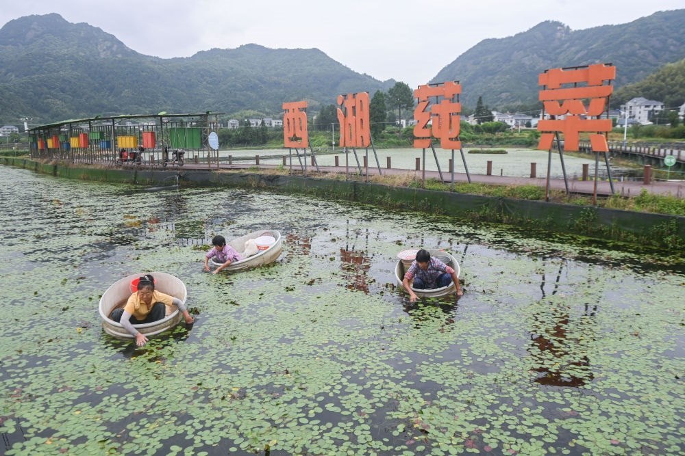 9月5日,在浙江省建德市航頭鎮(zhèn)烏龍村莼菜基地,村民劃著“盆船”在西湖莼菜產(chǎn)業(yè)園種植基地的水面上采摘西湖莼菜。近年來,浙江建德市航頭鎮(zhèn)以黨建聯(lián)建為紐帶,圍繞轄區(qū)特色農(nóng)業(yè)產(chǎn)業(yè)園建設,發(fā)揮新鄉(xiāng)賢、鄉(xiāng)土人才、農(nóng)創(chuàng)客作用,在烏龍村投資600余萬元新建了占地1900平方米的西湖莼菜產(chǎn)業(yè)園,引導新鄉(xiāng)賢爭當農(nóng)業(yè)致富帶頭人,打造西湖莼菜共富工坊。新華社記者 徐昱 攝