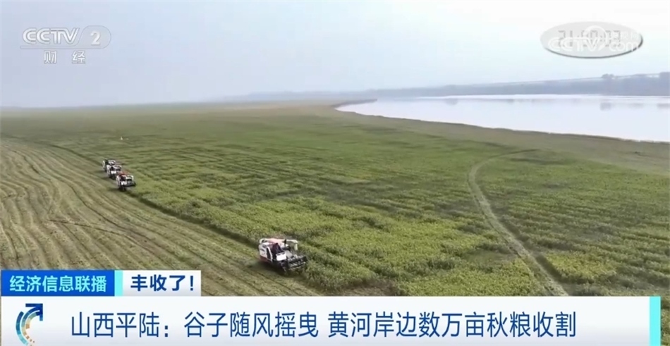 山西平陸:谷子隨風(fēng)搖曳 黃河岸邊數(shù)萬(wàn)畝秋糧收割