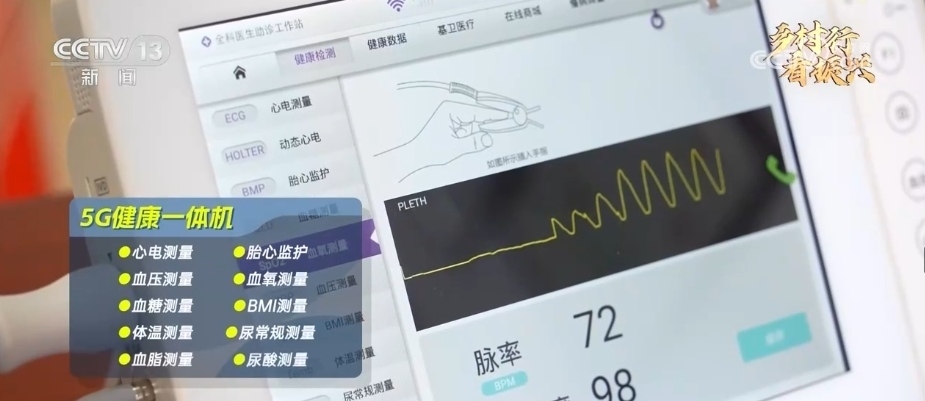這臺只有A4紙大小的5G健康一體機,是由省里統(tǒng)一配備的。除了能快速完成十多項檢查,還能通過5G網(wǎng)絡,隨時將心電、胎心數(shù)據(jù)上傳到市縣級醫(yī)院的診斷中心,由那里24小時值班的醫(yī)生進行診斷并出具報告。