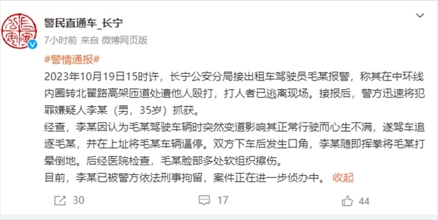 ·男子別停出租車打暈司機,警方:對出租車突然變道心懷不滿,已刑拘。