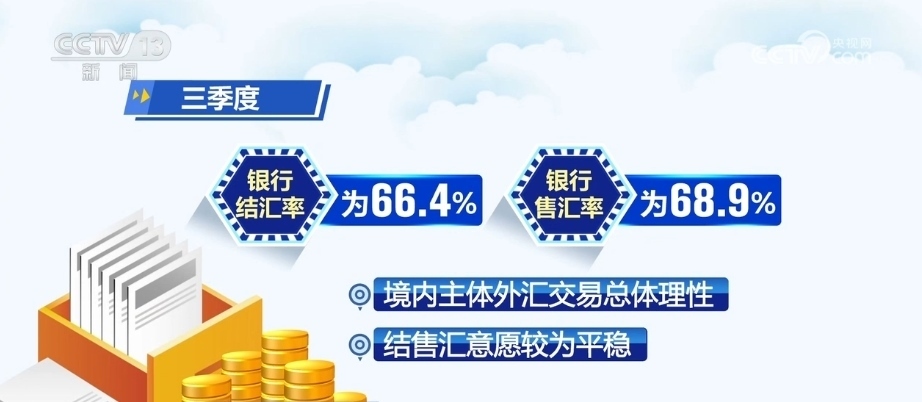 三季度,銀行結匯率為66.4%、銀行售匯率為68.9%。境內(nèi)主體外匯交易總體理性,結售匯意愿較為平穩(wěn)。