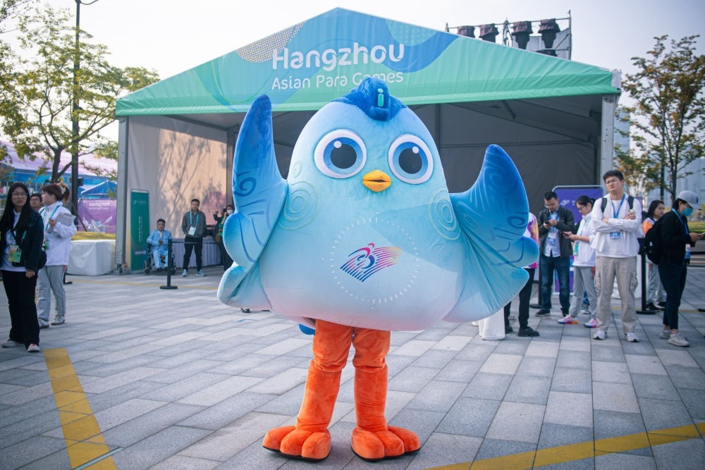 10月16日,杭州亞殘運會吉祥物“飛飛”在亞殘運村開村儀式上。新華社記者 江漢 攝