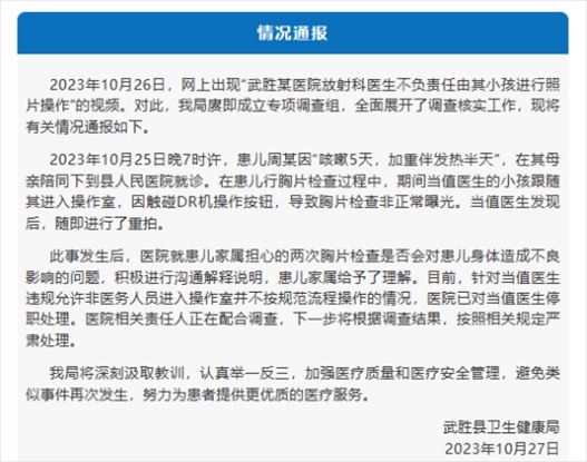 ·官方回應(yīng)醫(yī)生兒子給患者拍胸片:涉事醫(yī)生已停職。