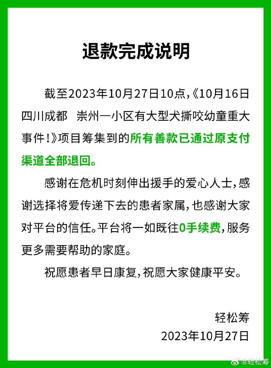 ·輕松籌平臺(tái)稱為被狗咬女童籌集的所有善款已全部退回。