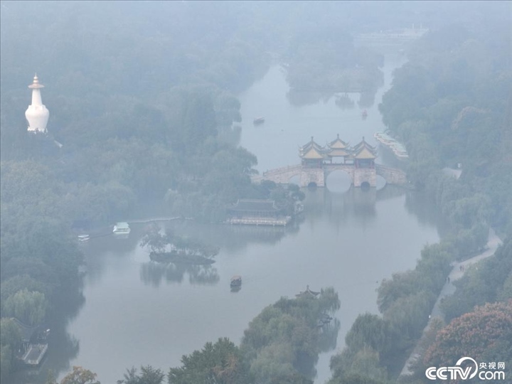 2023年10月27日, 江蘇省揚(yáng)州市出現(xiàn)大霧天氣,瘦西湖風(fēng)景區(qū)在霧中若隱若現(xiàn)、如夢(mèng)似幻,宛若一幅水墨畫。