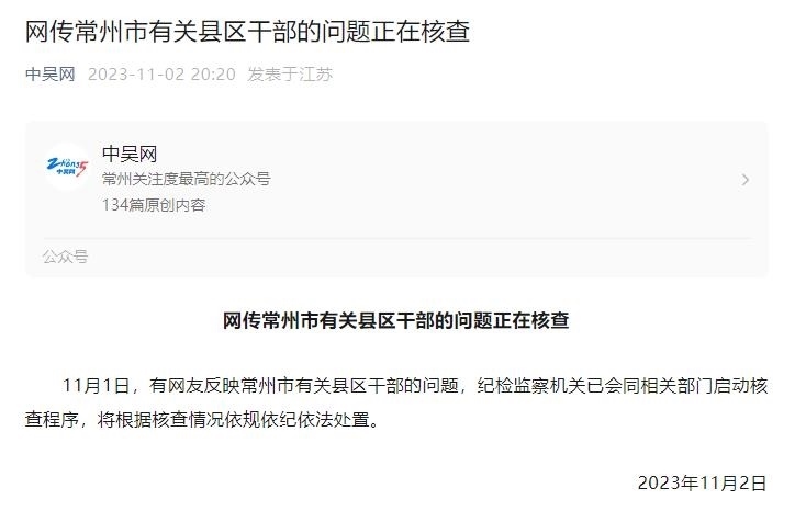 央視網(wǎng)消息:據(jù)“中吳網(wǎng)”微信公眾號(hào)消息,11月1日,有網(wǎng)友反映常州市有關(guān)縣區(qū)干部的問(wèn)題,紀(jì)檢監(jiān)察機(jī)關(guān)已會(huì)同相關(guān)部門啟動(dòng)核查程序,將根據(jù)核查情況依規(guī)依紀(jì)依法處置。