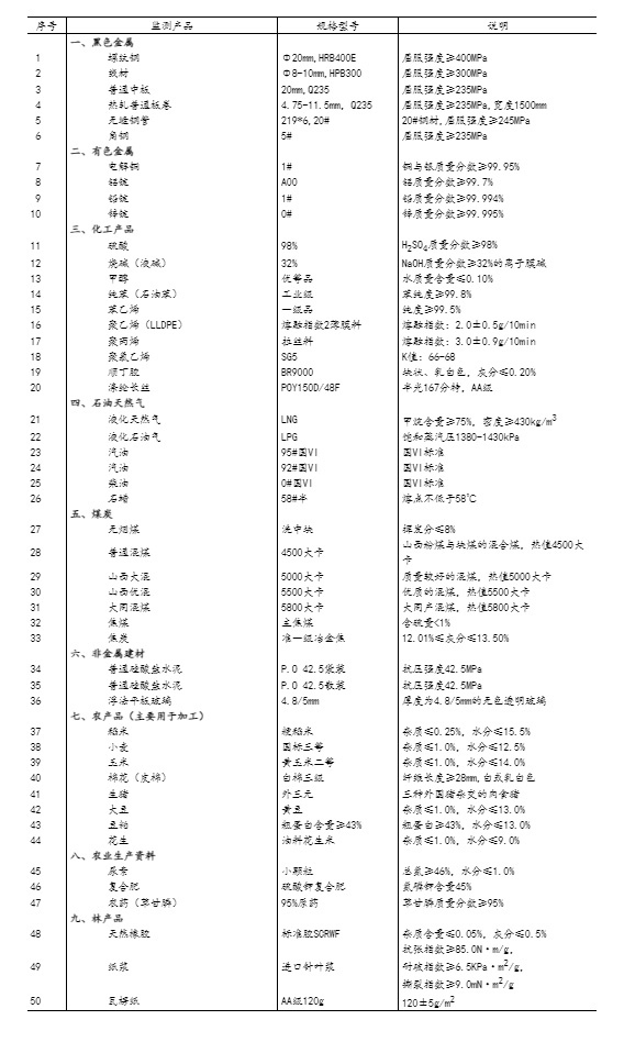 流通領域重要生產(chǎn)資料市場價格監(jiān)測內(nèi)容包括9大類50種產(chǎn)品的價格。類別與產(chǎn)品規(guī)格說明詳見附表。