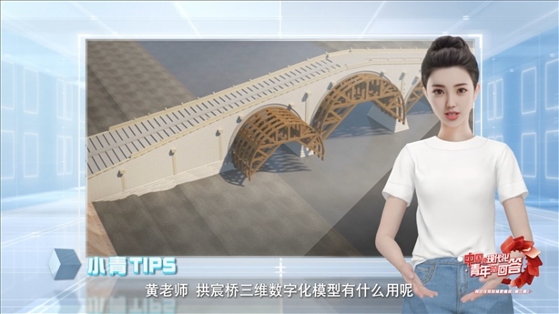 作為黃碩的好幫手,AI數(shù)字人小青給大家介紹說(shuō),三維動(dòng)畫(huà)中,展現(xiàn)了拱宸橋從選址、圍堰到打樁、搭建、填碎石的全過(guò)程,拱宸橋三維數(shù)字化項(xiàng)目成為大運(yùn)河保護(hù)傳承利用的案例之一。