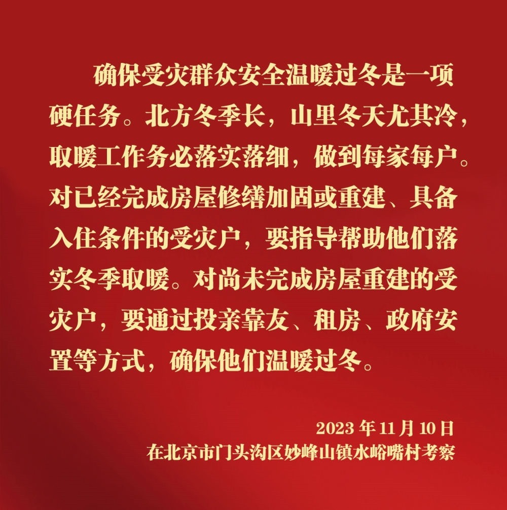 在妙峰山鎮(zhèn)水峪嘴村,習(xí)近平聽取該村情況介紹,隨后步行察看村容村貌,了解基礎(chǔ)設(shè)施恢復(fù)建設(shè)提升等情況。在村民李盟家,習(xí)近平詳細(xì)詢問房屋受損、修繕支出、取暖等情況。