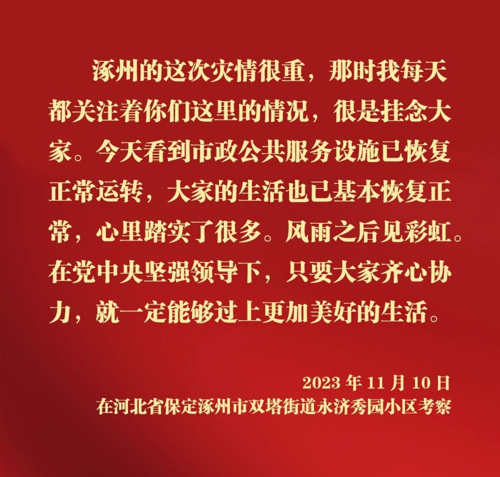 11月10日,中共中央總書記、國家主席、中央軍委主席習(xí)近平在北京、河北考察災(zāi)后恢復(fù)重建工作。他先后來到門頭溝、保定等地,實(shí)地了解災(zāi)后恢復(fù)重建情況。