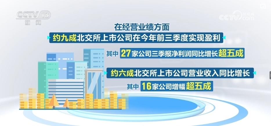 在經營業(yè)績方面,約九成北交所上市公司在2023年前三季度實現盈利。其中,27家公司三季報凈利潤同比增長超五成。約六成北交所上市公司營業(yè)收入同比增長,其中,16家公司增幅超五成。