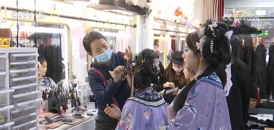 這股國(guó)潮風(fēng)也帶動(dòng)了南京漢服的租賃、妝造等周邊產(chǎn)業(yè),離老門東很近的剪子巷,500米左右的巷子就有20家左右的漢服租賃店。