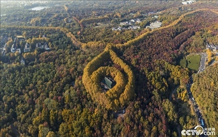 2023年11月19日,南京,初冬時(shí)節(jié)的鐘山風(fēng)景名勝區(qū)層林盡染,色彩斑斕??罩懈╊晃嗤浒鼑拿例g宮,宛如一條“金色項(xiàng)鏈”,美不勝收。