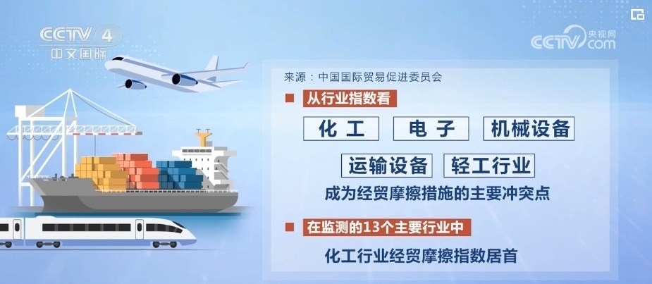 而從行業(yè)指數(shù)看,化工、電子、機(jī)械設(shè)備、運(yùn)輸設(shè)備和輕工行業(yè)成為經(jīng)貿(mào)摩擦措施的主要沖突點(diǎn)。在監(jiān)測的13個(gè)主要行業(yè)中,化工行業(yè)經(jīng)貿(mào)摩擦指數(shù)居首。