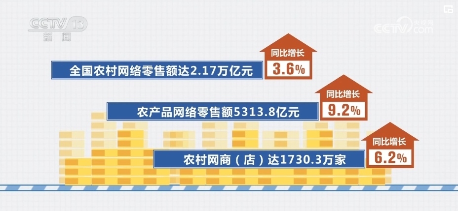 全國農(nóng)村網(wǎng)絡(luò)零售額達(dá)2.17萬億元,同比增長3.6%;農(nóng)產(chǎn)品網(wǎng)絡(luò)零售額5313.8億元,同比增長9.2%;農(nóng)村網(wǎng)商(店)達(dá)1730.3萬家,同比增長6.2%。