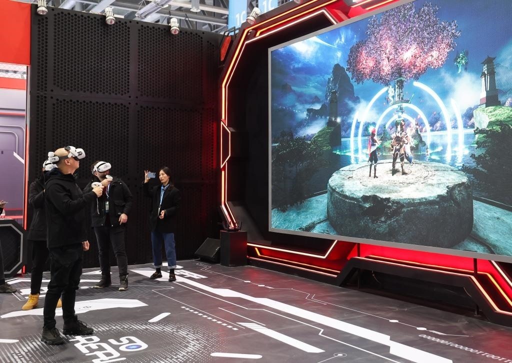 11月23日,在第二屆全球數(shù)字貿(mào)易博覽會上,參觀者戴上VR眼鏡體驗虛擬游戲空間。新華社記者 徐昱 攝